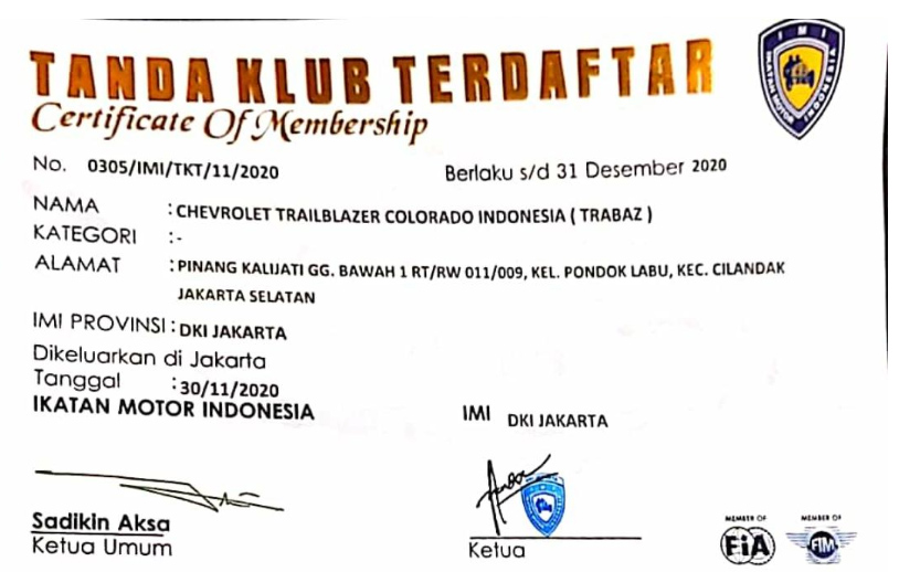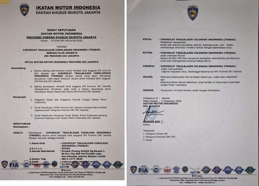 2. Surat Keputusan Ikatan Motor Indonesia Provinsi DKI Jakarta, Nomor: 015/5K/IMI-DKI/A/XII/2020 tentang CHEVROLET TRAILBLAZER COLORADO INDONESIA Sebagai Anggota Klub IMI DKI Jakarta